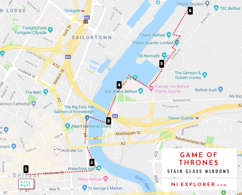 Also, for some reason Google won’t let us mark the sixth location at the end of the Titanic Slipways. It’s easily found though, as once you’re at location 5, you’ll see Titanic Belfast - the last window is just around the back of it.
